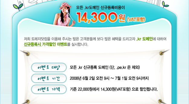 [À̺¥Æ®] .kr ½Å±Ôµî·Ï½Ã °¡°ÝÇÒÀÎ 14,300¿ø !! |